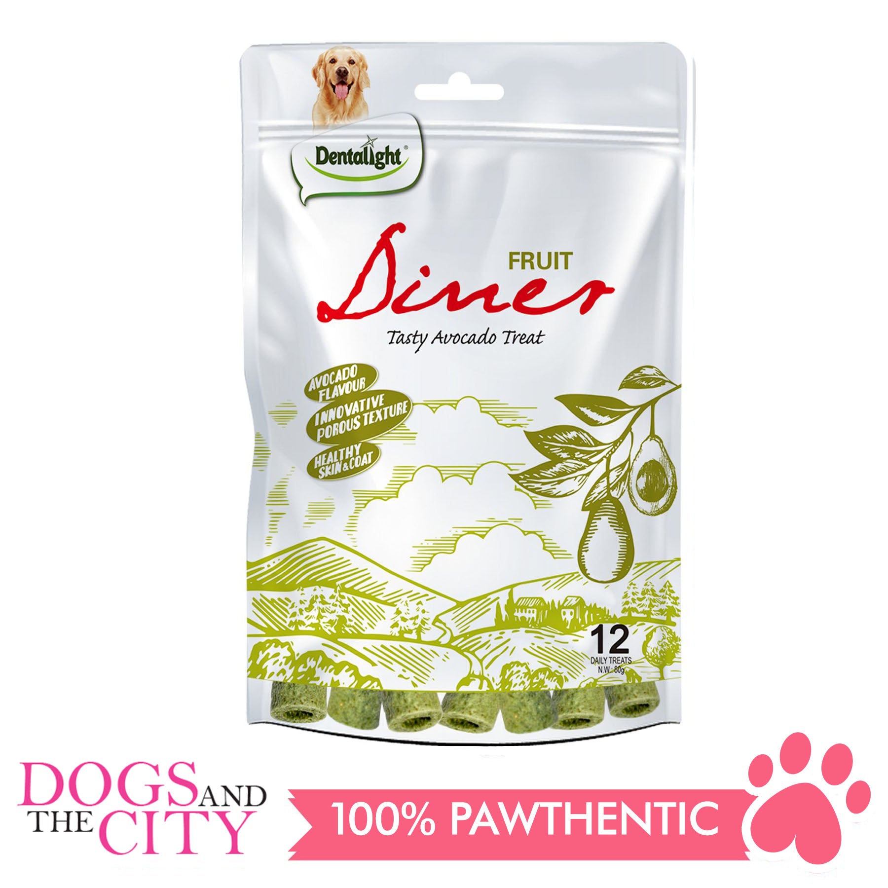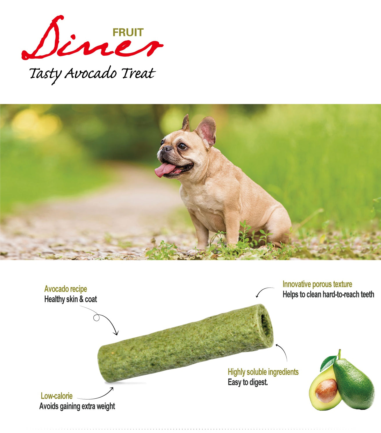 -Our Fruit Diner Tasty Avocado Treats are healthy, low-calorie treats with real avocado, supporting healthy skin and coat. The chewy texture helps clean your dog's hard to reach teeth and the high digestible formula is perfect for dog who loves to chew.
