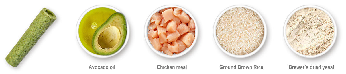 Potato starch, Ground brown rice, Oatmeal, Glycerin, Avocado, Chicken Meal, Avocado Oil, Sodium caseinate, Brewer's dried yeast, Calcium Carbonate.