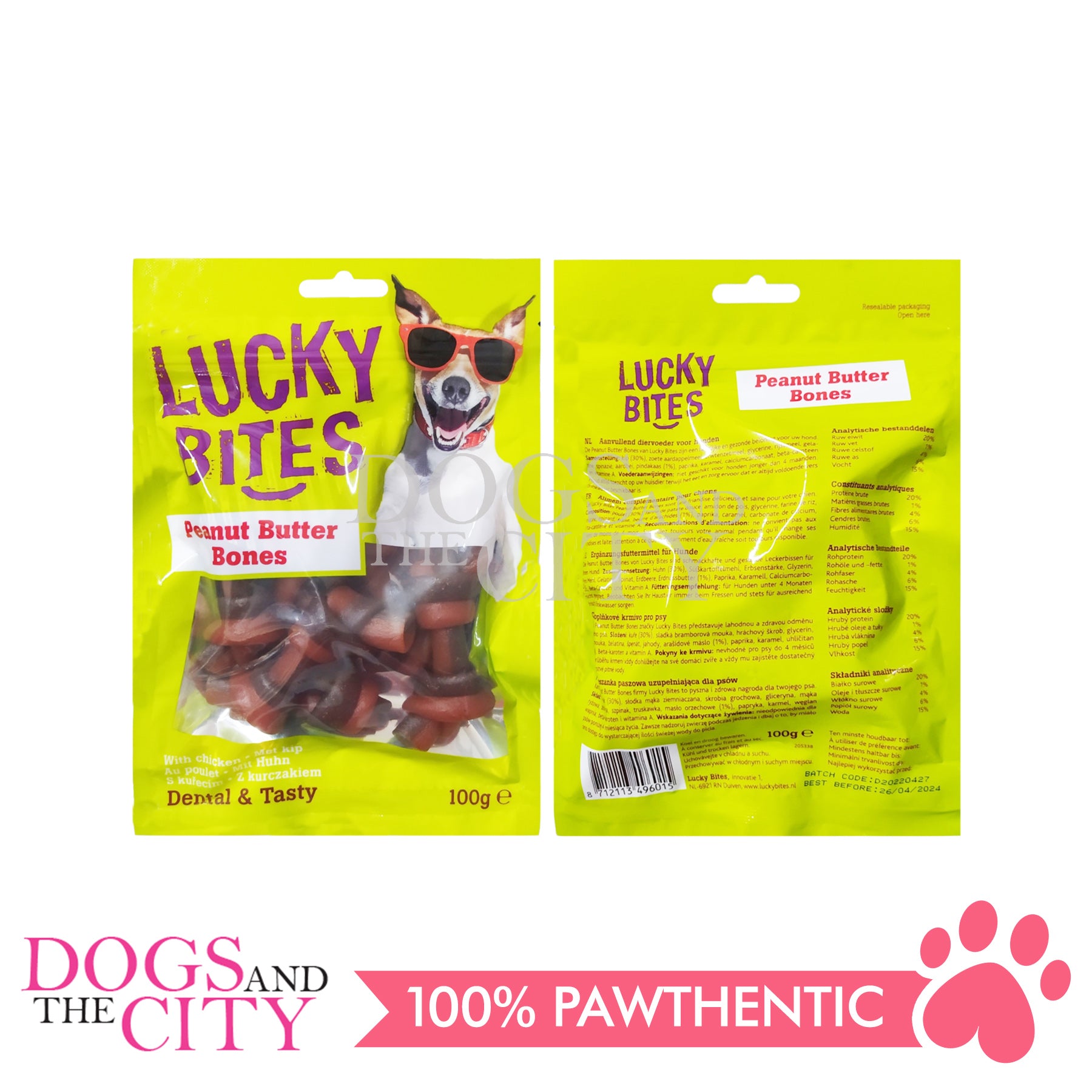 • Complementary pet food for dogs. Lucky Bites Peanut Butter Bones are a delicious and healthy reward for your dog.