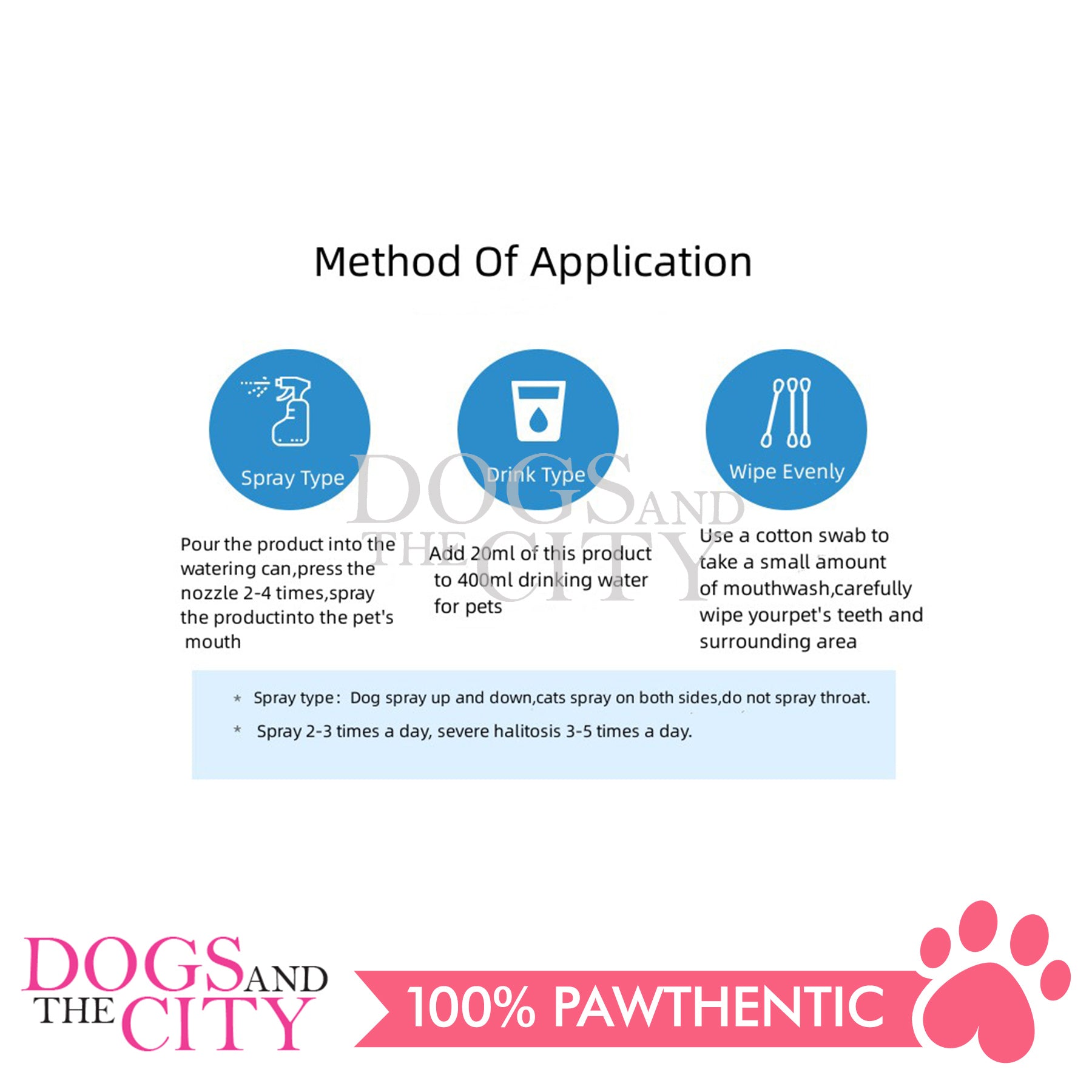 1. Spray: Pour this product into the watering can, open the pet's mouth, press the spray head 2-4 times, and spray the product line up and down the dog, and the pet cat on both sides, do not spray the throat). Take a small amount of mouthwash with a cotton swab and carefully wipe the pet's teeth and surrounding areas.