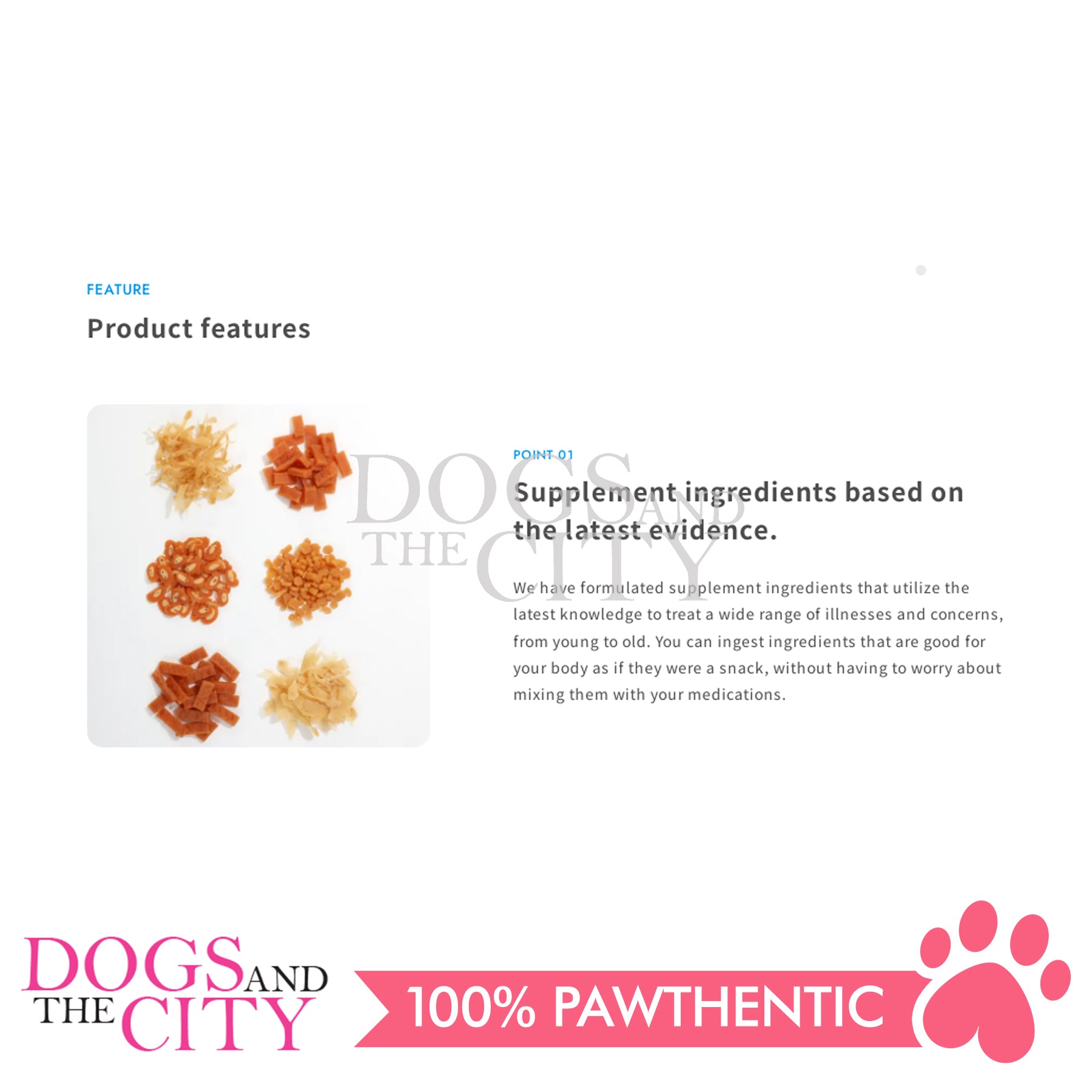 raw materials Meat (chicken tenderloin, chicken liver, kangaroo), wheat flour, vegetable oil, perilla oil, glycerin, sorbitol, modified starch, bonito extract, yeast extract, phosphate (Na), BCAA, L-carnitine, vitamins (A, D, E, B₁, B₂, niacin, B₆, folic acid, B₁₂, pantothenic acid, C), taurine, arginine, zinc gluconate, glutamic acid, lactic acid bacteria, lactoferrin