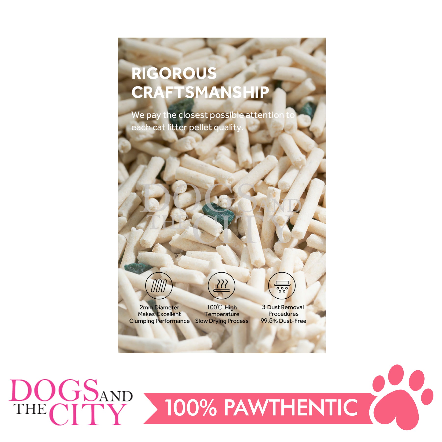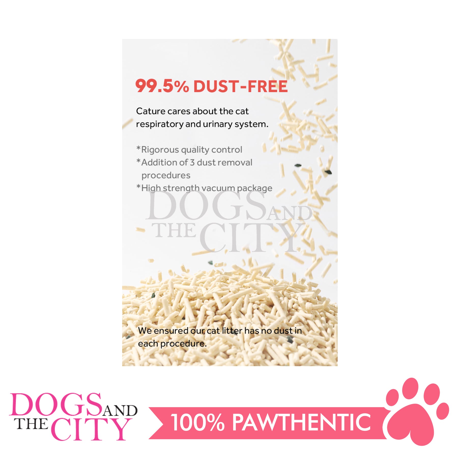 - Rigorous quality control, addition of 3 dust removal procedures and high strength vacuum packages all makes sure cat litter has no dust in each procedure. It’s safe for allergic cats and cares for cat repiratory and urinary system.