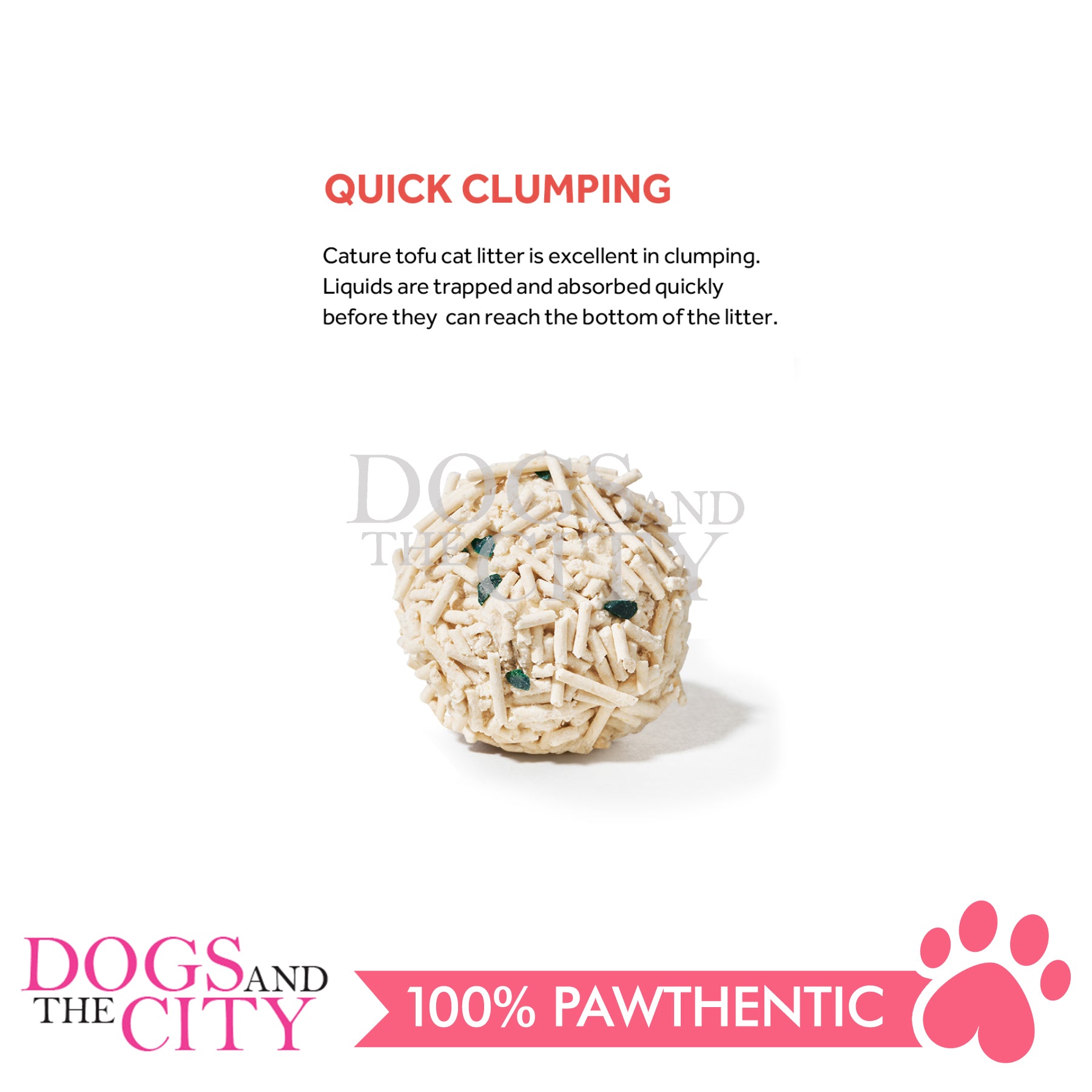 -Cature Tofu Cat Litter has 2mm diameter precision granules, excellent in clumping. Liquids are trapped and absorbed quickly before they can reach the bottom of the litter. Clumps may be removed and disposed of easily in the toilet, leaving a fresh layer for the next time.