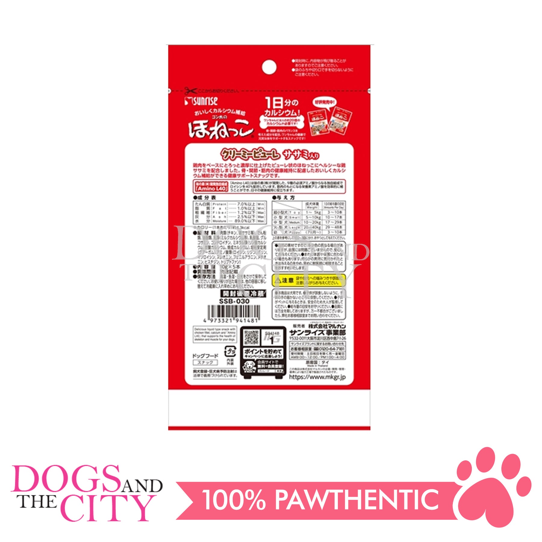 Ingredients: Meat (chicken, chicken fillet, etc.), starch, oils and fats, milk (milk calcium, etc.), lactic acid bacteria, glucosamine, chondroitin, minerals (calcium phosphate, calcium carbonate, calcined calcium), thickening stabilizer. (guar gum), amino acids (leucine, lysine, valine, isoleucine, threonine, phenylalanine, methionine, histidine, tryptophan)