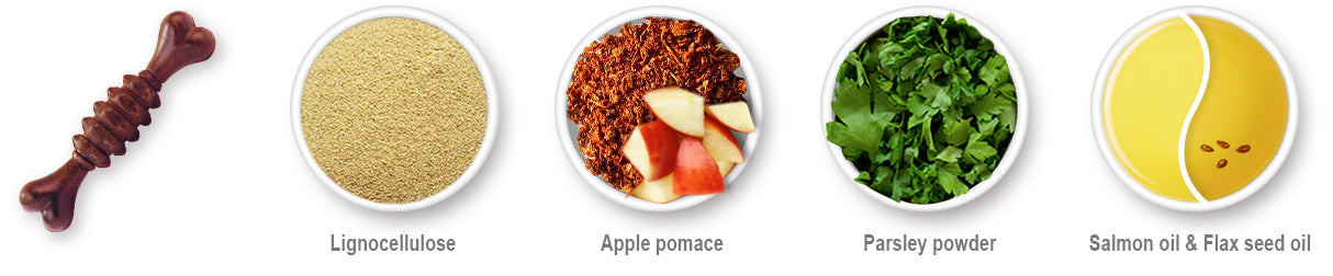 • COMPOSITION: Potato starch, Pea flour, Lignocellulose, Glycerine , Apple pomace, Gelatine, Parsley powder, Coconut oil 0.5%, Dried green mussle (source of glucosamine and chondroitin sulfate) 0.5%, Lecithin.