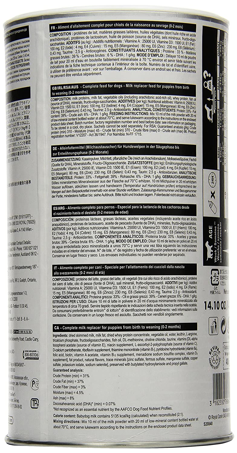This Royal Canin Babydog Milk is a perfect complete milk re-placer feed for your puppies, from birth to weaning (0-2 months)!